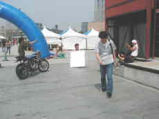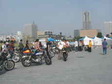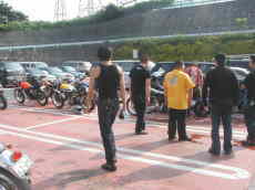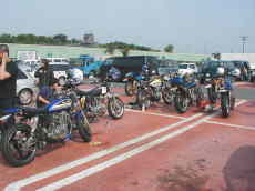 ただ当日は火出そうなくらいの猛暑、しかも海沿い(のはず)、朝9時とは言えとても日向でマッタリできる状況じゃないさ、この集団、ナリ&バイクは若いが中身はオヤジ的状態の人多数(オイラも当然そっち)、というわけでとっとと日陰に避難避難!慣れない早起き(?)も手伝ってトロトロモード、キタヤンに至っては日陰に逃げ遅れて夢遊病状態で徘徊中、このまま妖精の世界に昇天しないでねぇ〜