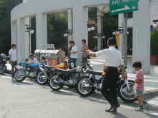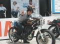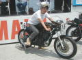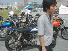 そして今回イベントの目玉!?ロードボンバー開発者の「島さん」の開発秘話、スラの田中社長を交えて色んなネタ話を披露!ロードボンバーってのは・・・まぁ凄いバイクなのです(笑)、かつて鈴鹿8耐にも出場して上位入賞を果たしたっていう伝説的なバイク、SRの元みないなもんか、そんな中なんとロードボンバーに跨リたい人はどうぞ!こんな機会でもなきゃなかなか出来ない経験だわ、というわけで遠慮・・・なんて言葉はどこへやら、当然速攻で行きました、ちなみに道ずれ生贄をあと3名用意