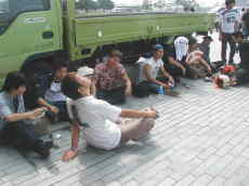んでしばらくすると・・・状態は一番右の画像参照・・・最悪です(核爆)、少ない日陰を求めて群がってきた・・・とても普通とは思えない集団の完成!というわけで人物紹介、左からキタヤン@妖精、手前・koikeさん@1児のパパ、奥・ヒロシさん@撮影担当、NARIさん@まんま、Limeさん@ひょっこりひょうたん島風味、伍長@農作業モード、tact*さん@アロハ夏気分、冨永さん@ダンディズム、こう大君@爽やか同郷ボーイ、あとは・・・見えませんので放置(爆) |