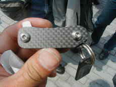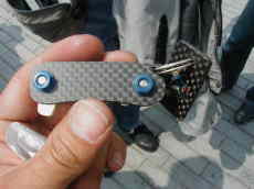そんなこんなでしばらくすると・・・我らが教祖、KEIさん登場!一応、あくまで一応初対面ってことで、まずはご挨拶・・・「ムムムッ・・・強ぇ〜」第一印象はこれね(笑)、だってエライごっちぃ〜んやもん(マッチョ!)、早速なにやらゴソゴソ、tact*さん呼んで「これこれ!」と・・・ん?何々?興味津々で手元見ると、「なんじゃこりゃぁ〜!!!」なものがそこに。これもパッと見じゃどんなもんか分からないよなぁ、実はこれキーケース!くるっと回すとSRのキーが出てくるのだ、しかもキーとケースはジャストフィット状態、んで変態っぷりの説明はここから。実はこれ、ドライカーボンです(笑)、さらにさらに、ボルトも「ち」、裏でとめてあるナットも「ち」、しかもナットに至っては陽極酸化加工の蒼「ち」仕様・・・これで・・・十分でしょ・・・さすが教祖、変○っぷりの年期が違うぜい(w、これにはtact*さんも絶賛絶賛!そりゃ・・・こんなのオイラも欲しいって!