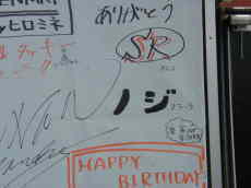 | 前2会場でも行なわれた巨大寄せ書き、まぁグランドスラム達成記念に!と思って壇上にあがってみると・・・ん?見たことある書き込みが・・・「ノジスラーラ」・・・やっと今になって意味が分かったよ(笑)、ねぇc@ge君(ニヤリ)、犯人は・・・九州会場のカスタムグランプリの人です |