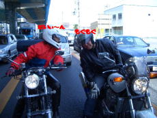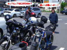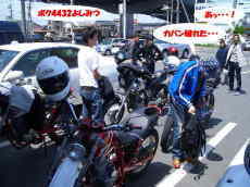 ・・・っとここで早速問題発生。15台での移動となるとさすがに編隊で走行するのは非常に困難かつ迷惑甚だしい。ってなワケで多少バラバラとなって移動。そこでやっぱりこの人達、takaさん、ジョン吉っちゃん、そしていさおちゃんの3名が『ばいぃぃ〜〜〜〜〜ん!!!!』の音と共に去って行ってしまった。まぁ地元のよしみっちゃんがいるからいいな・・・って横にいるじゃねぇ〜か〜!!!そこでたくやさんとの会話