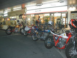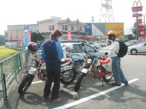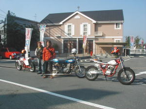 んで無事に集合場所の南海部品に到着、いっつも早く来てるエンジンさん、今日もやっぱり既に来てましたね。お待たせいたしましたぁ。 とりあえず今回は遅刻せずに到着・・・ってジョン吉っちゃん、出る間際にあんなノンビリしてたら遅刻するって!しかもきっちり寝坊もしてるし。 まぁそれはともかくとして、本日は快晴!ホント晴れ渡ってて気持ちヨカですわぁ〜、まさにツーリング日和☆って意気込んでました。その後メンバーに降りかかる数々のトラブル・・・この時は予想などする由もなく・・・。 とりあえず集合場所の南海部品の前でパシャリ!もう1人の参加者のshigeさんは、当日の午前中仕事の為、昼から合流予定。 |