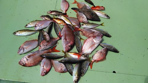 本日の釣果(丸&ヒラアジ約40匹、チダイ&鯛約50匹とメバルとアコウ)