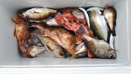 本日の釣果(15cm〜25cmのメバル約40匹、ホゴ約20匹とアジ約20匹)