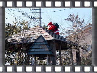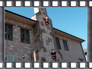 まるでロッククライミングのごとく 家のエントツを登るサンタさん2人。
